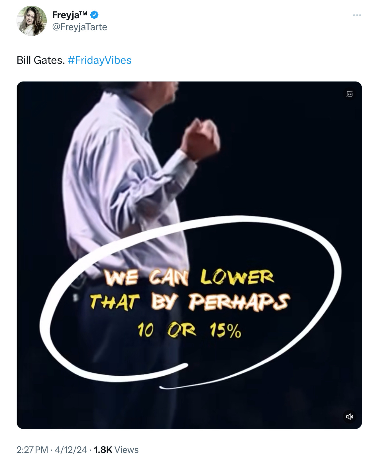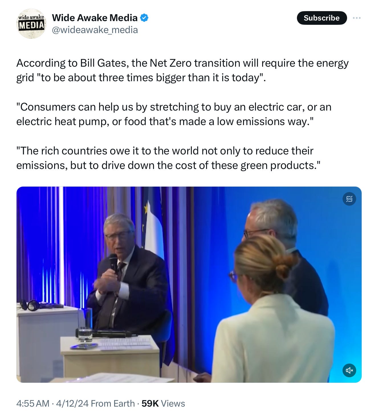 Obviously, Bill isn’t worried about Bidenflation, or that the average cost of an EV is close to 6 figures, or how ineffective “sustainable green energy” is to produce that low-emissions food…or pretty much anything else. Must be nice.