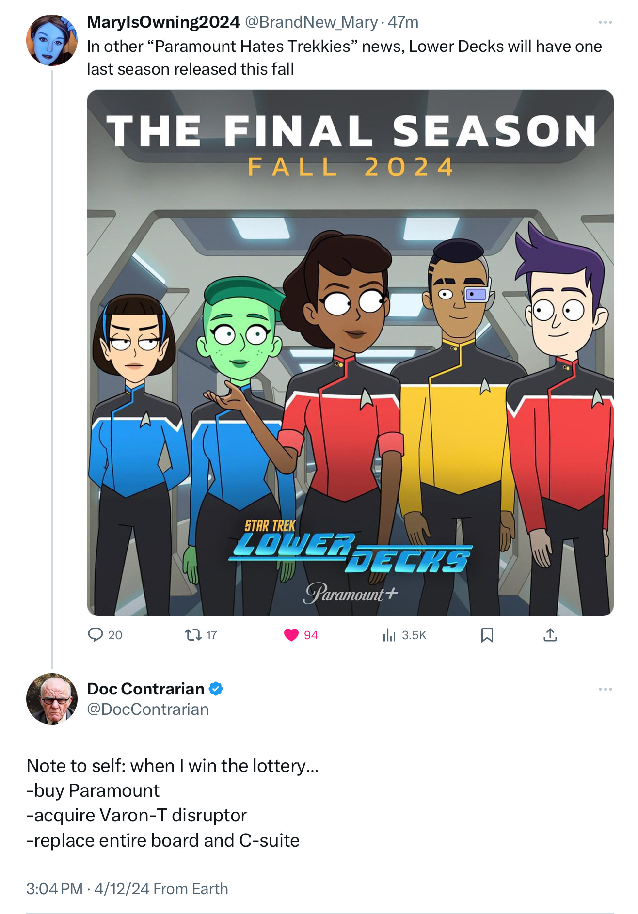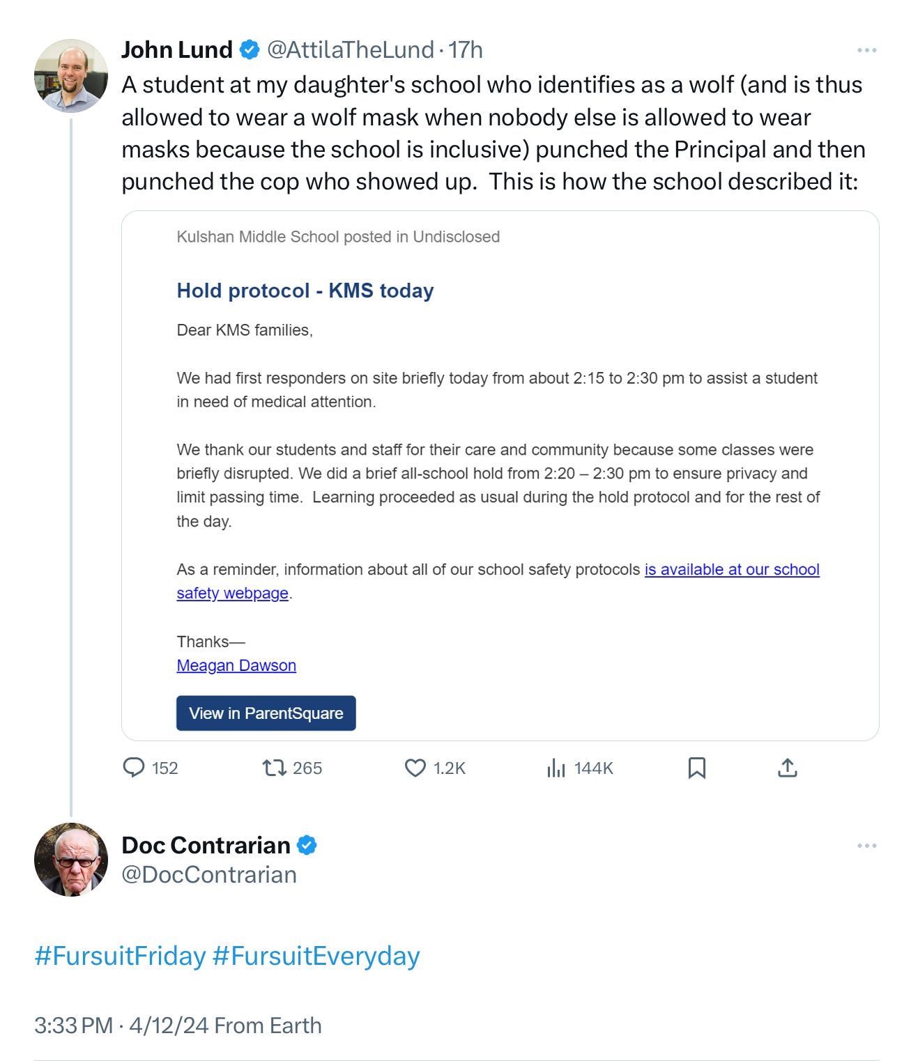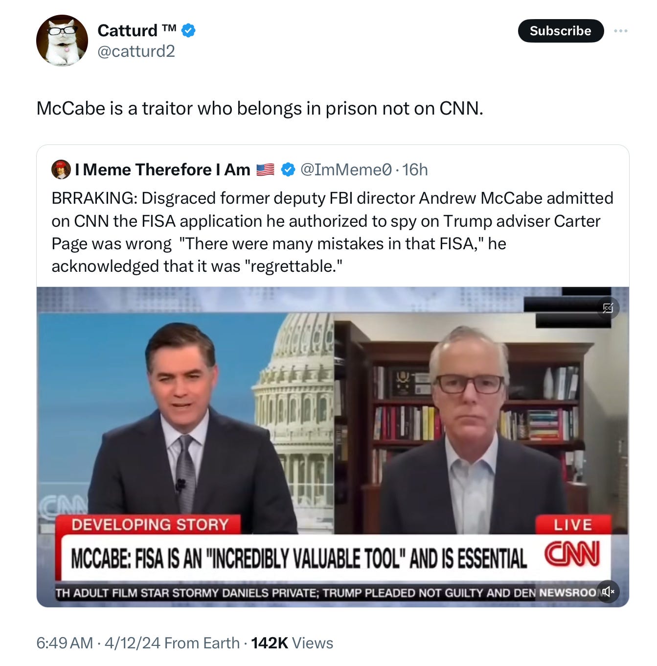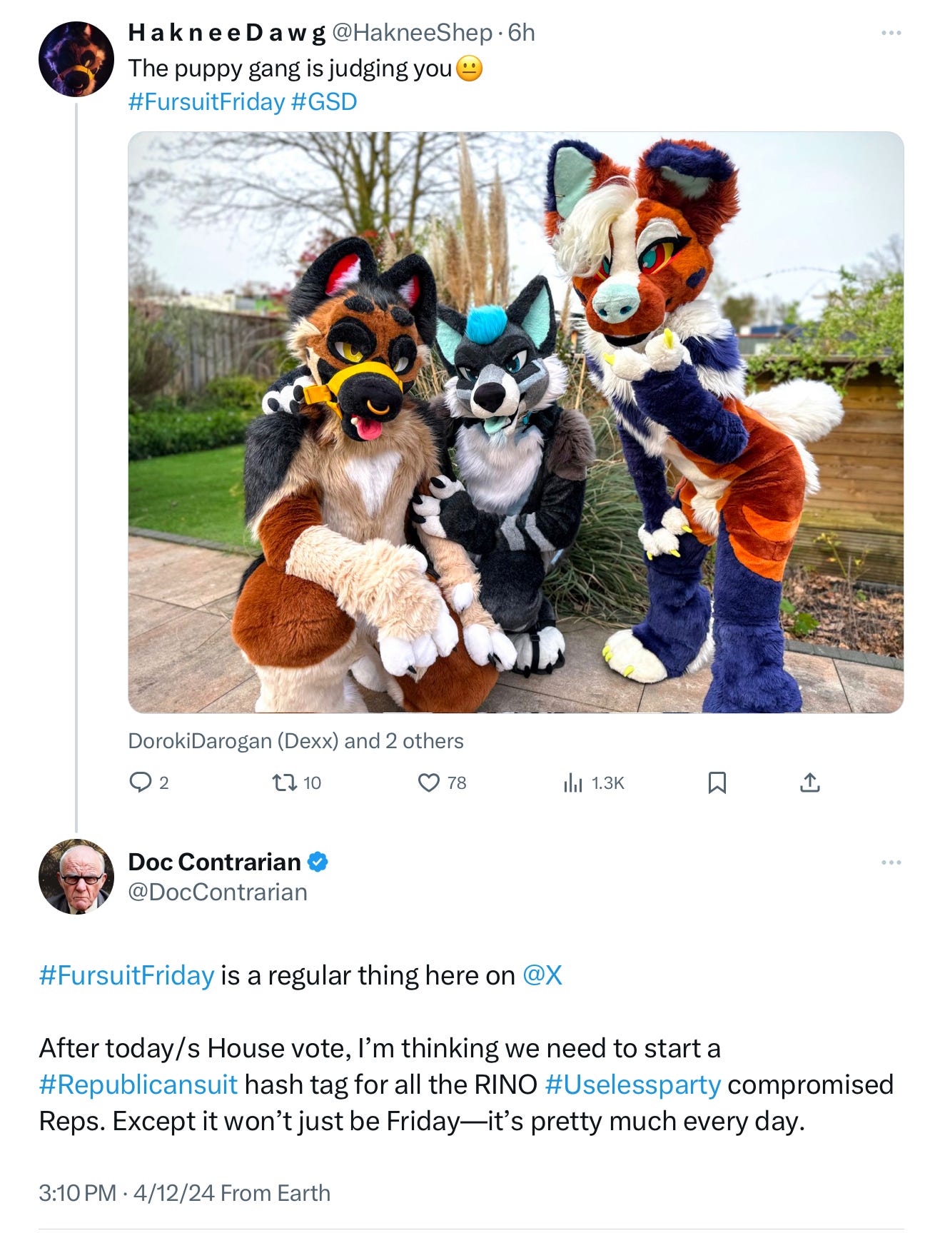 FISA goes on, Johnson goes full Traitor, FBI, Iran ponders, Israel braces, France preps, Lower Decks cancelled, Bidenflation bites, FursuitFriday & RINOsuit everyday, Uselessparty, tons of memes, wee!