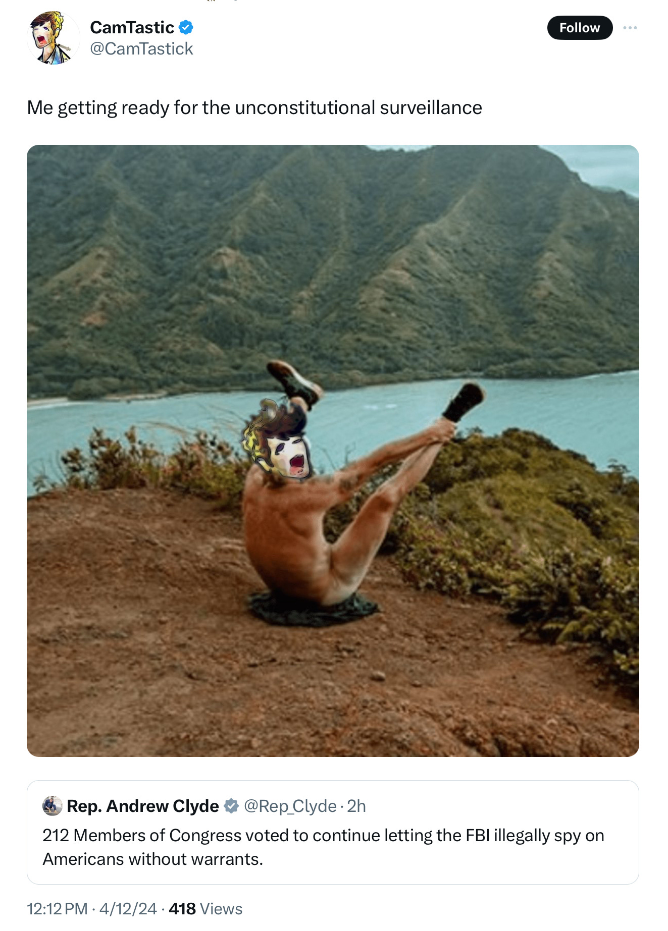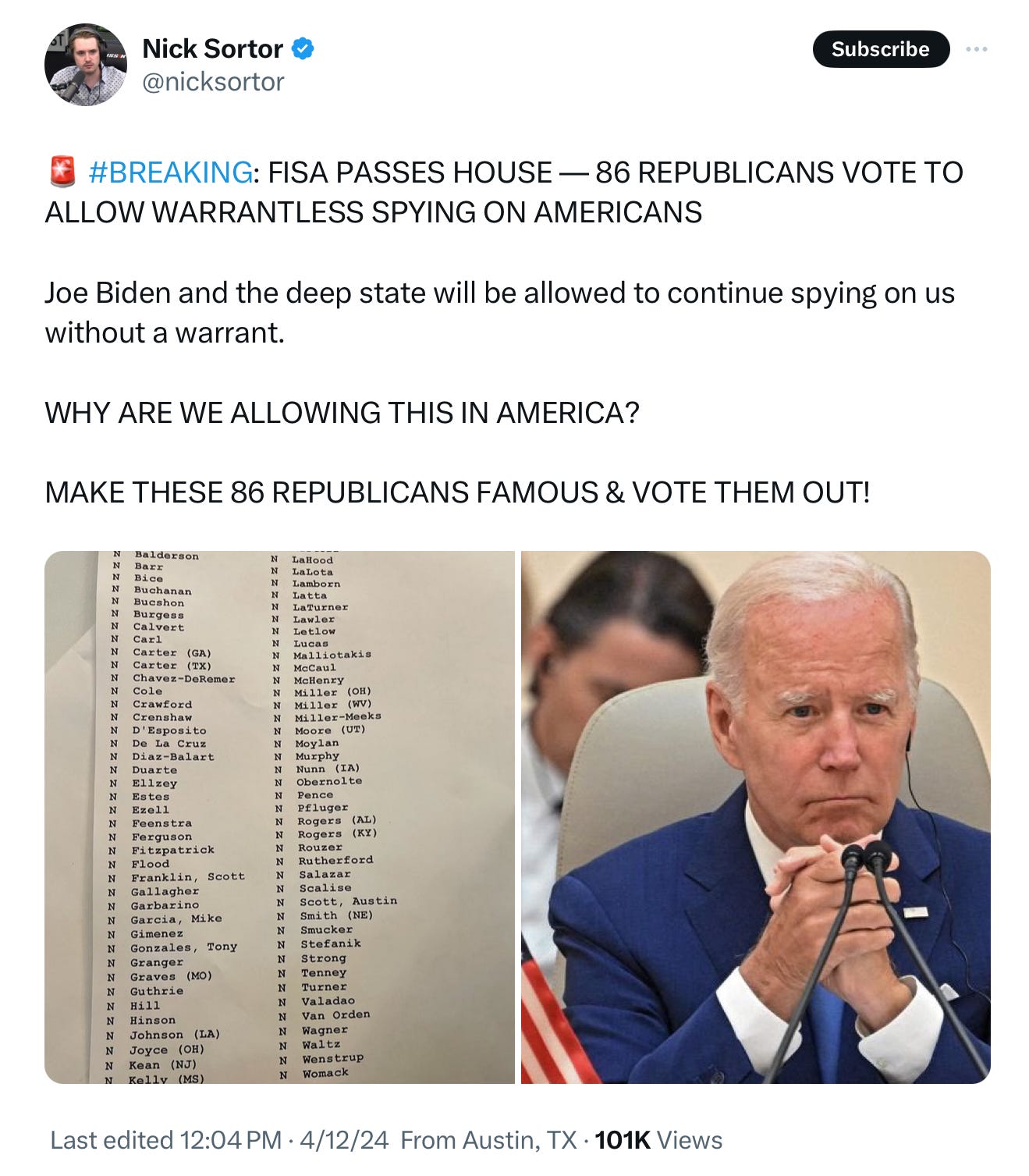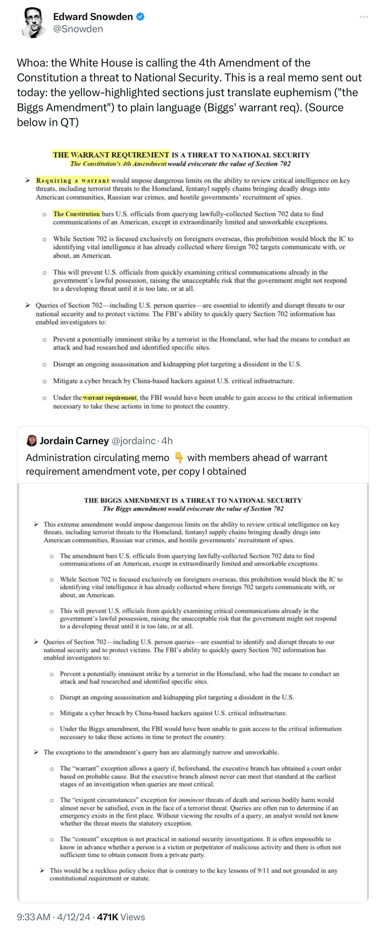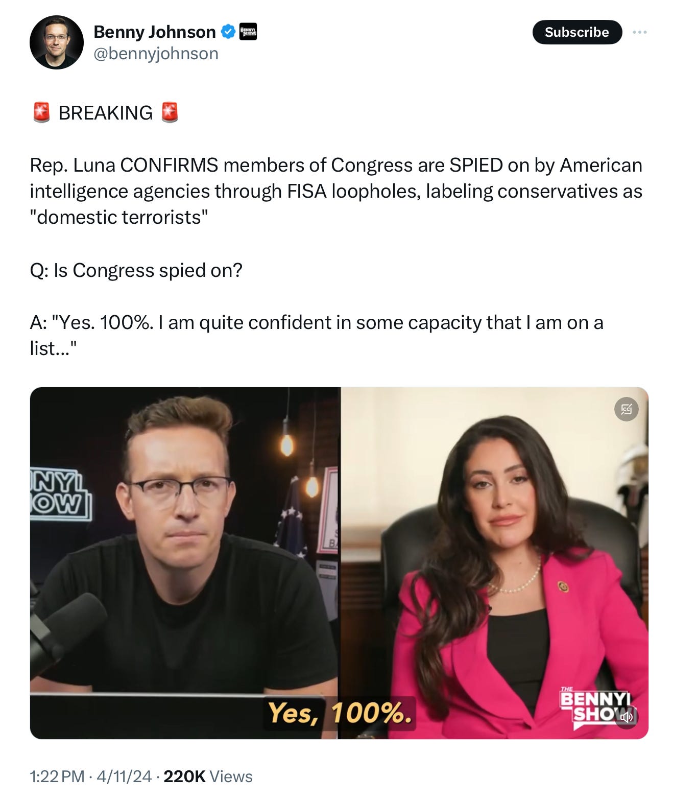 Just a reminder. Also, remember that the lines between the Alphabets have basically disappeared, as the FBI-turned-CIA guy recently caught on hidden camera by @SoundInvestig showed. If you follow this Substack, you saw that video a couple of days ago. This is what Benz calls The Blob, and they now can basically spy on you at will, without a warrant or any reason except they just want to. If your Rep voted NO on the Biggs amendment, you might want to ask them why.