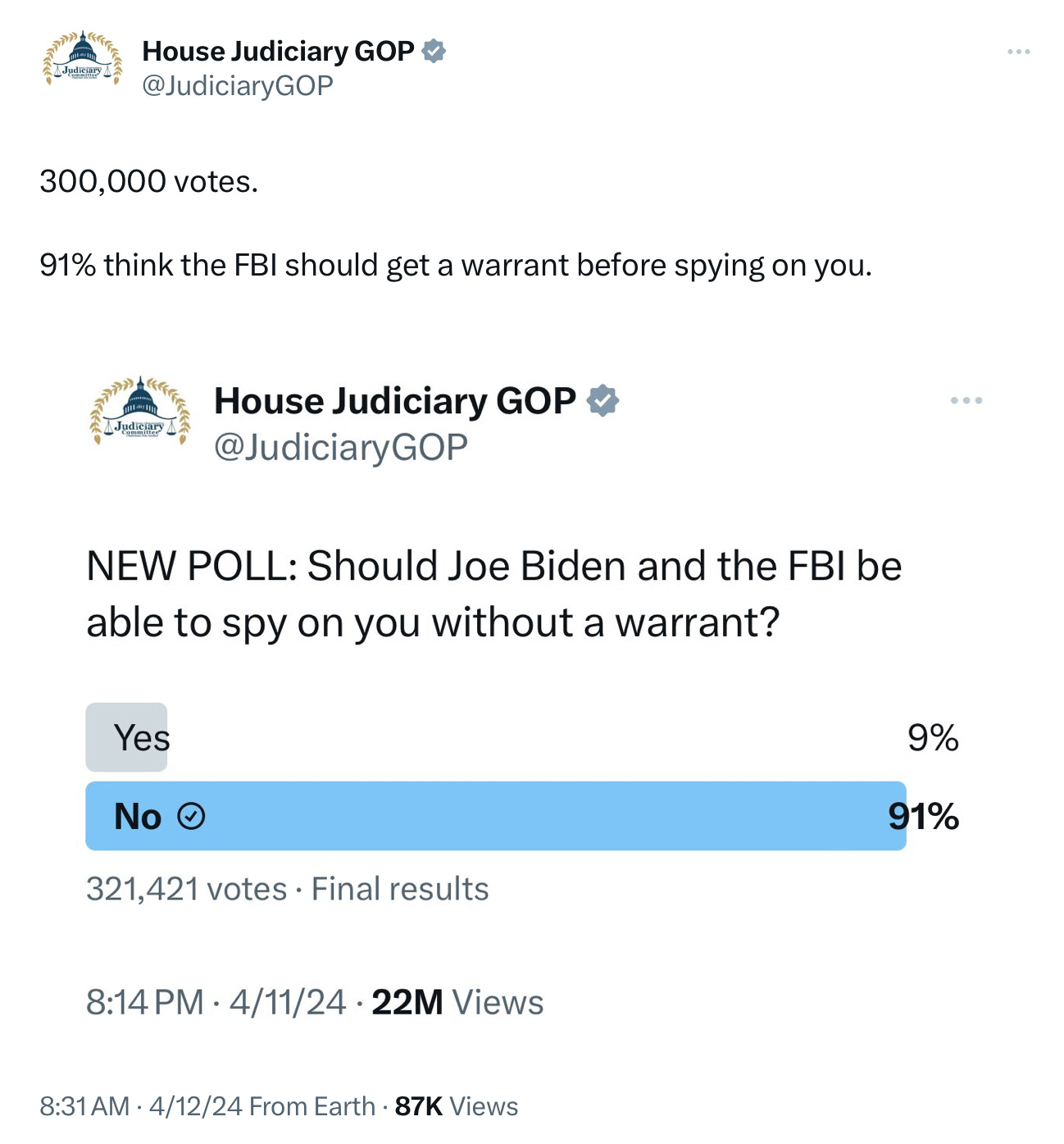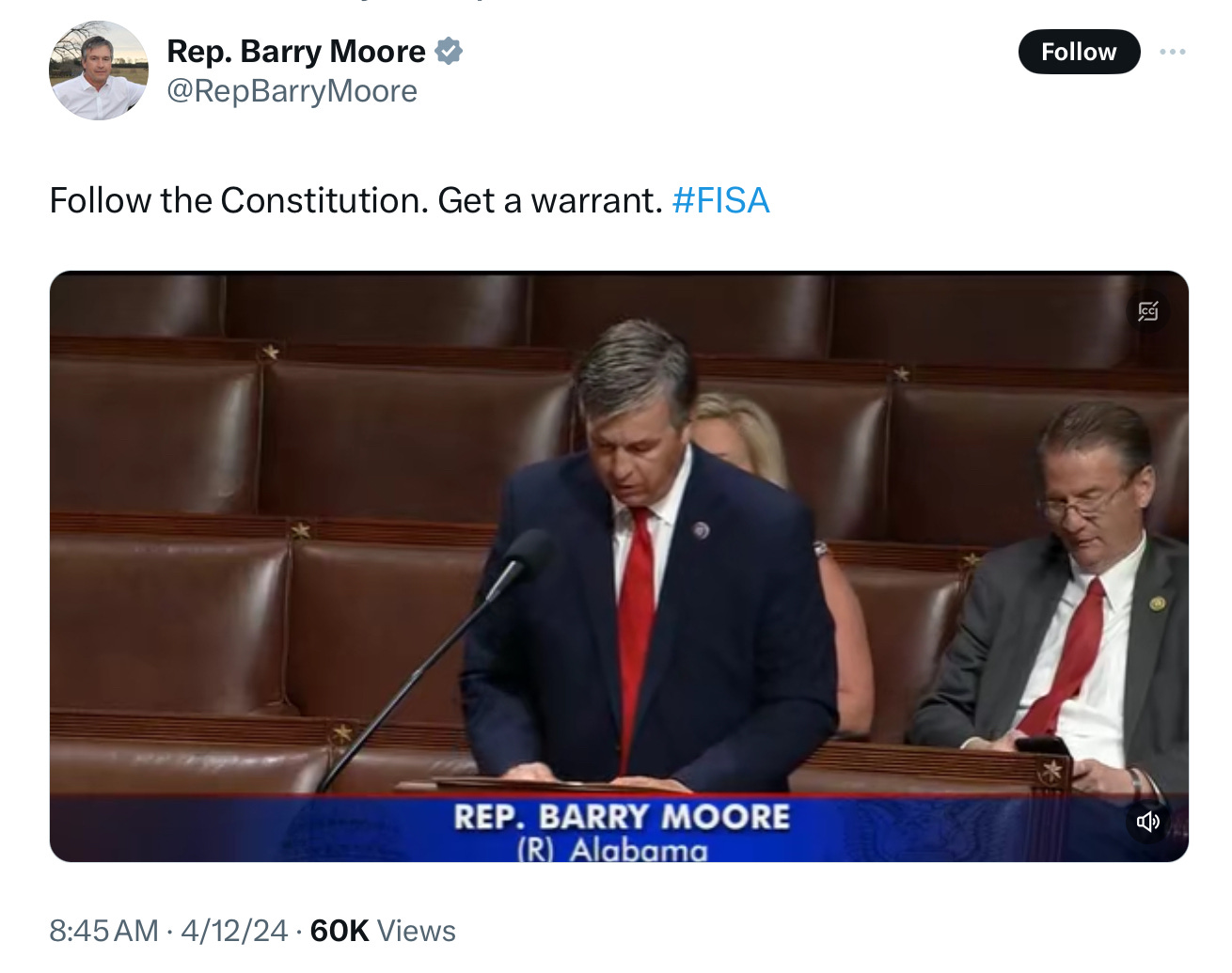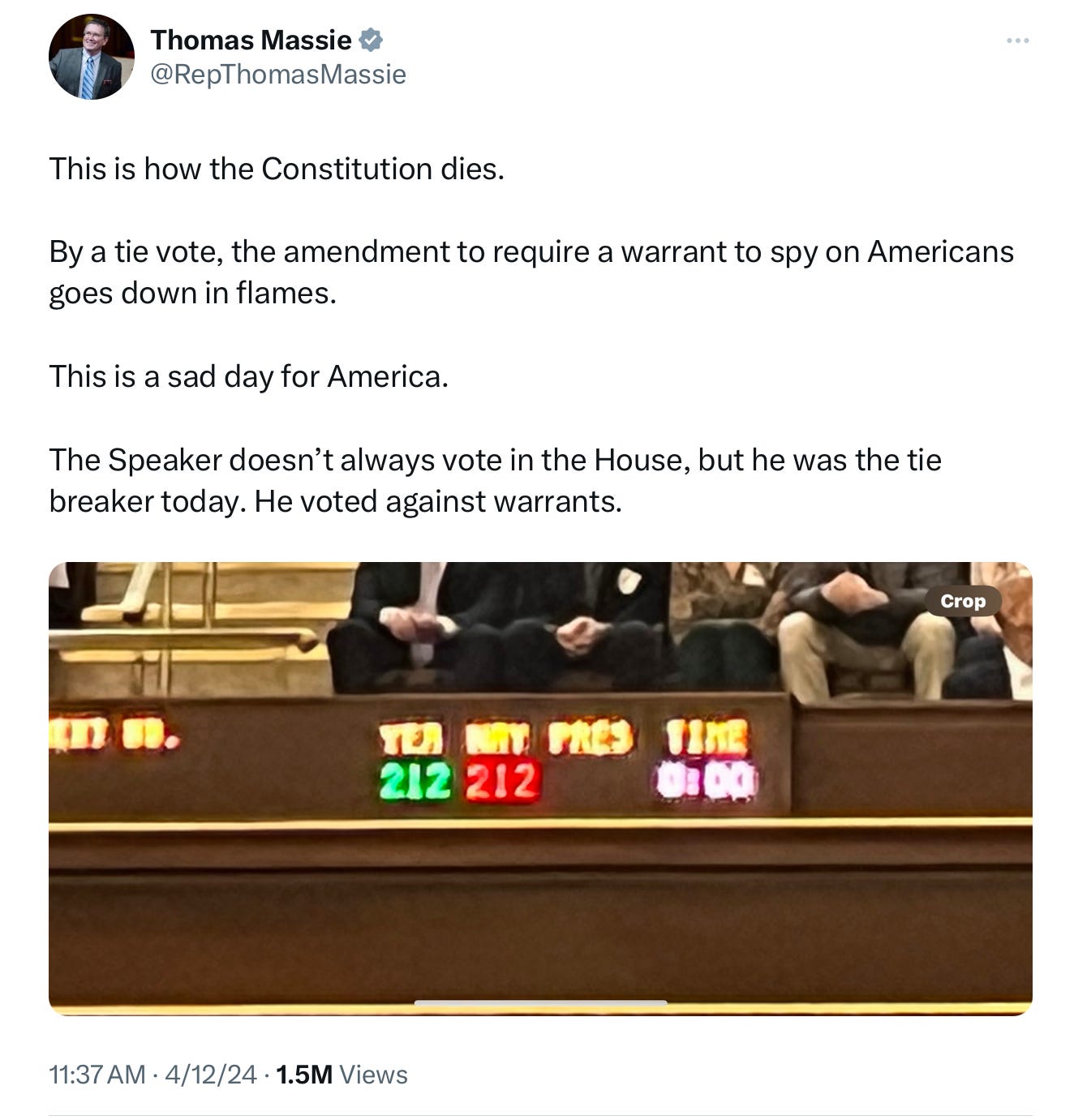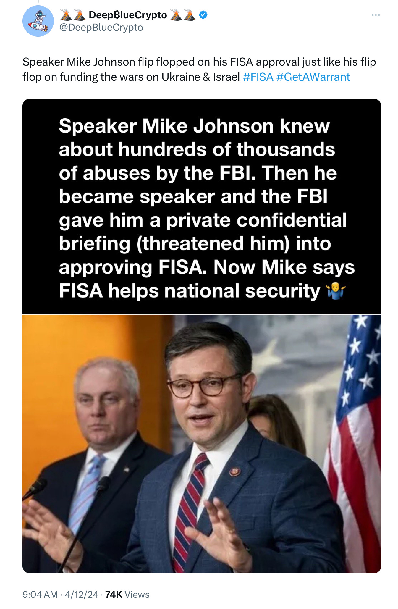 Just a reminder. Also, remember that the lines between the Alphabets have basically disappeared, as the FBI-turned-CIA guy recently caught on hidden camera by @SoundInvestig showed. If you follow this Substack, you saw that video a couple of days ago. This is what Benz calls The Blob, and they now can basically spy on you at will, without a warrant or any reason except they just want to. If your Rep voted NO on the Biggs amendment, you might want to ask them why.