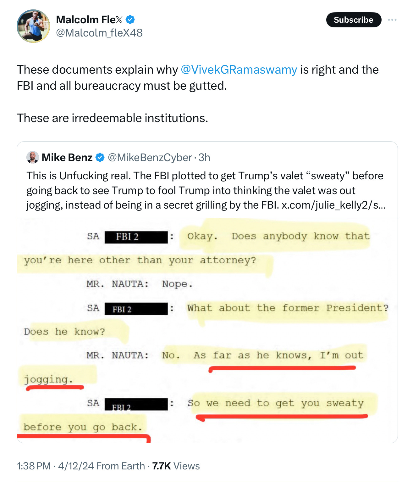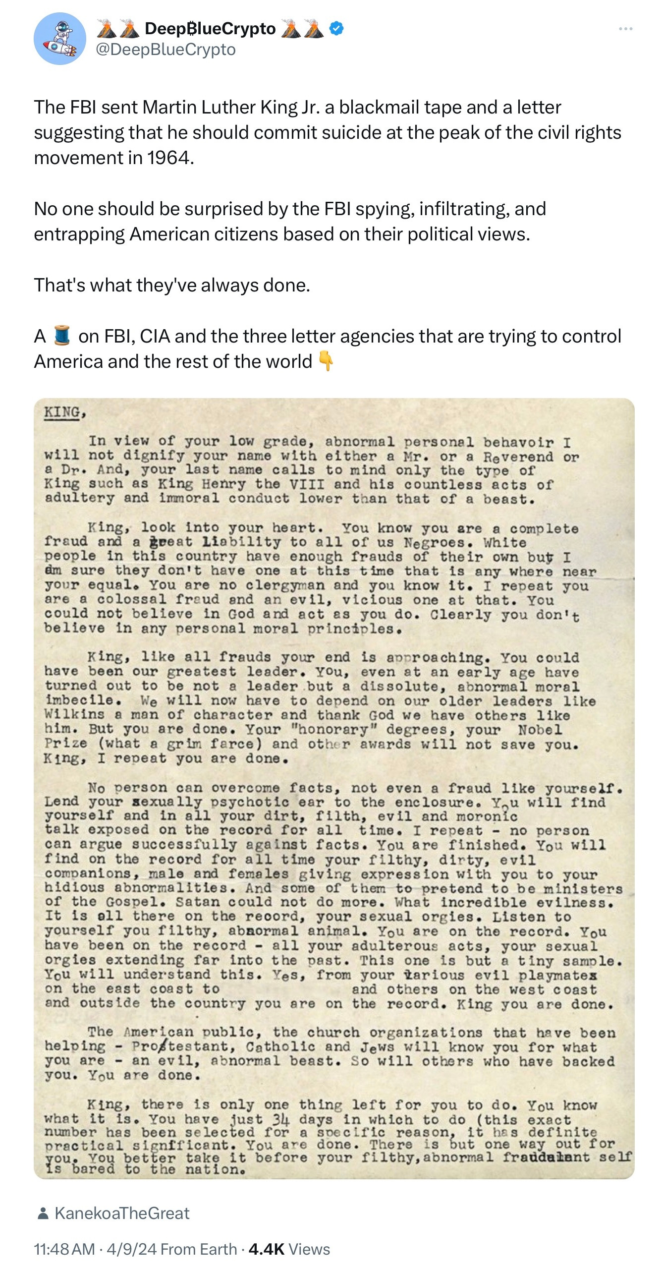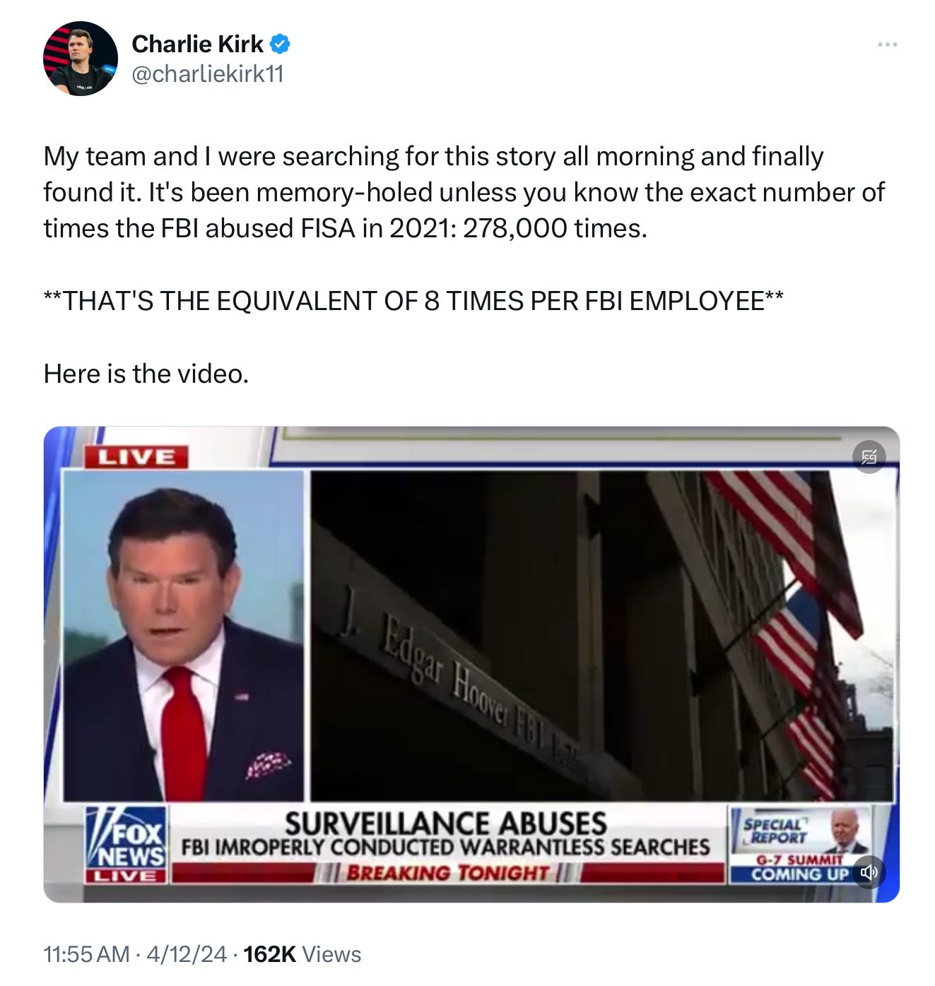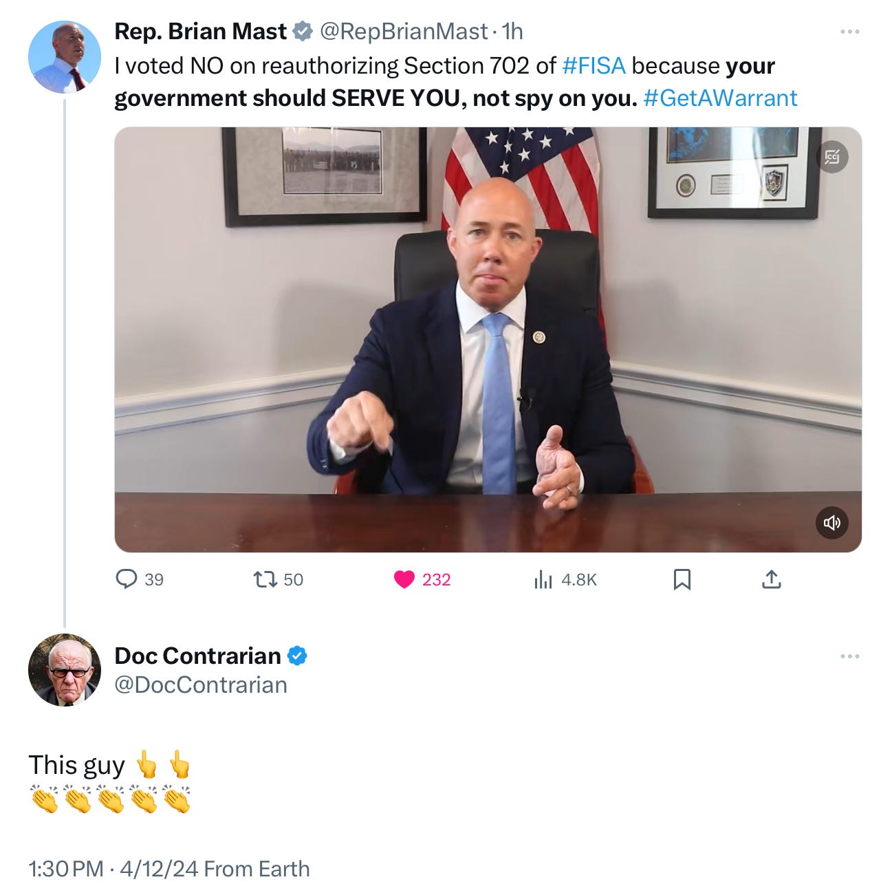 Just a reminder. Also, remember that the lines between the Alphabets have basically disappeared, as the FBI-turned-CIA guy recently caught on hidden camera by @SoundInvestig showed. If you follow this Substack, you saw that video a couple of days ago. This is what Benz calls The Blob, and they now can basically spy on you at will, without a warrant or any reason except they just want to. If your Rep voted NO on the Biggs amendment, you might want to ask them why.